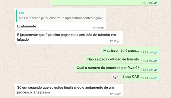 Novamente estamos recebendo denúncias de associados que golpistas estão utilizando mensagens via WhatsApp (alguns com fotos dos advogados da Abesprev) informando liberação de processos judiciais indicando aos que recebem a mensagem que precisam entrar em contato urgente com os advogados da Abesprev. A pessoa se identifica como advogado da Abesprev e solicita a transferência de recursos financeiros para a pagamento de certidão de trânsito em julgado de ação contra a Fazenda Estadual. Veja print abaixo: