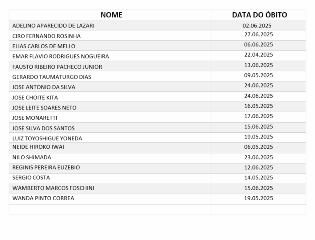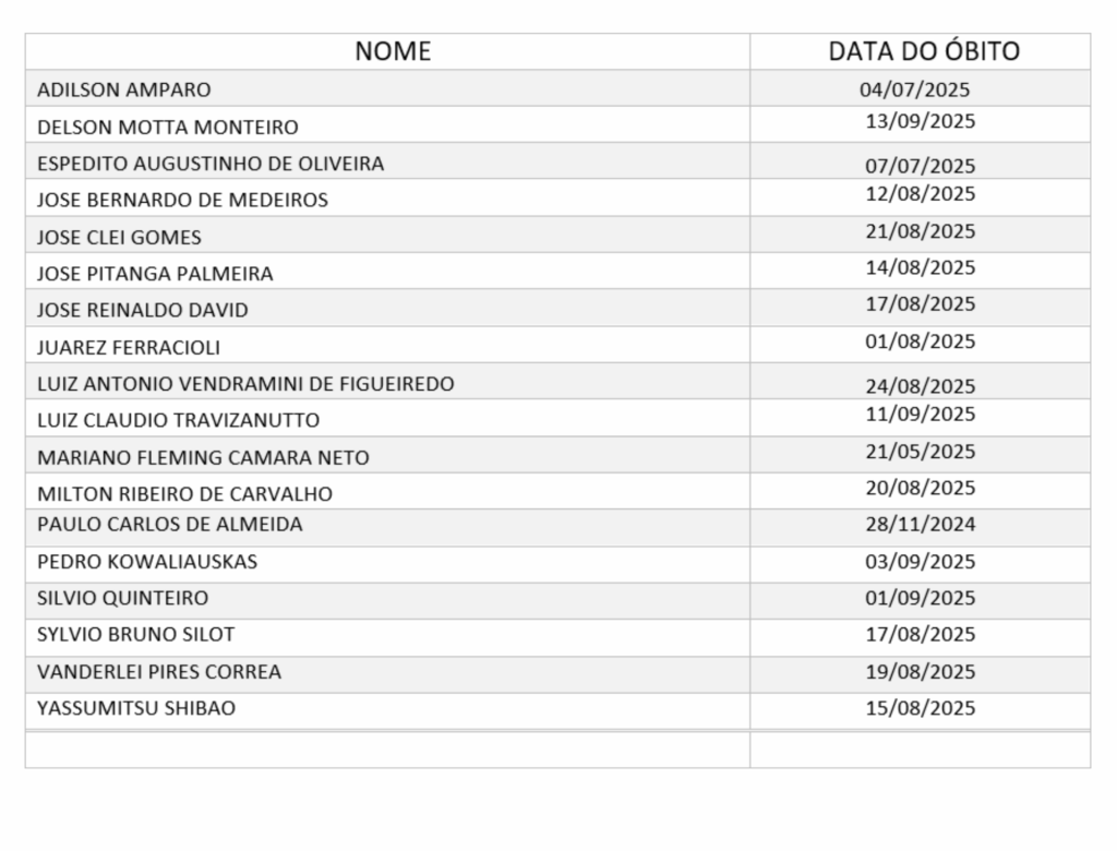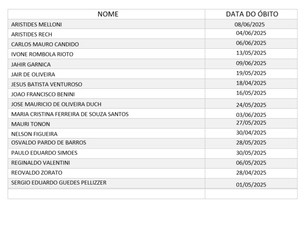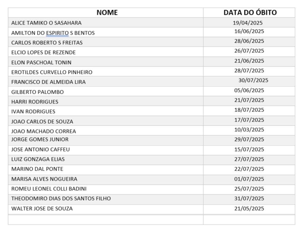 A Mutuoprev registra com tristeza o falecimento dos ex-banespianos e participantes do Plano II (caixinha da morte) conforme relação abaixo, tendo efetuado aos beneficiários o pagamento do pecúlio previsto no Plano.